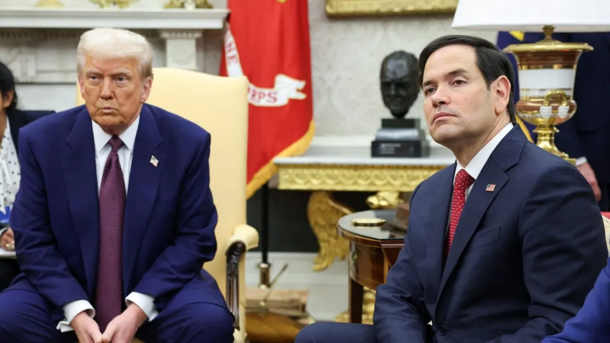 الرئيس الأميركي دونالد ترمب بجانب وزير الخارجية ماركو روبيو في البيت الأبيض. 13 فبراير 2025 - REUTERS