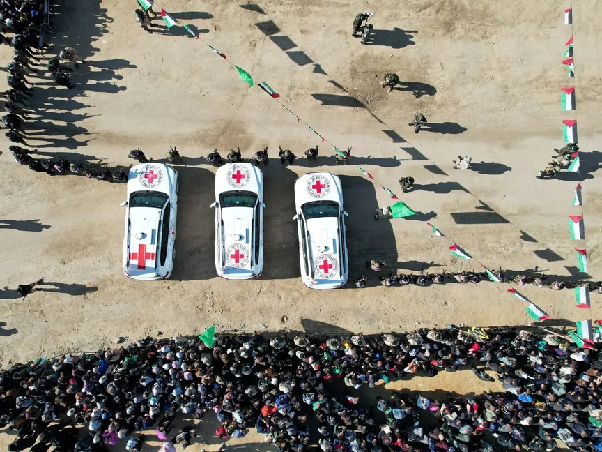 فلسطينيون يتجمعون بالقرب من مركبات الصليب الأحمر الدولي قبل لحظات من إطلاق سراح الأسرى الإسرائيليين الثلاثة ضمن الجولة السادسة لتبادل الأسرى بين إسرائيل وحركة حماس. 15 فبراير 2025 - REUTERS