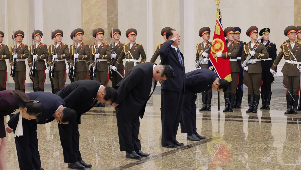 وكان الزعيم الكوري الشمالي برفقة شقيقته كيم يو جونج، وهي مسؤولة رفيعة في حزب العمال الحاكم، إلى جانب عدد من مساعديه، حيث انحنى "بأقصى درجات التبجيل"، وفقاً لما نقلته وكالة الأنباء المركزية الكورية.