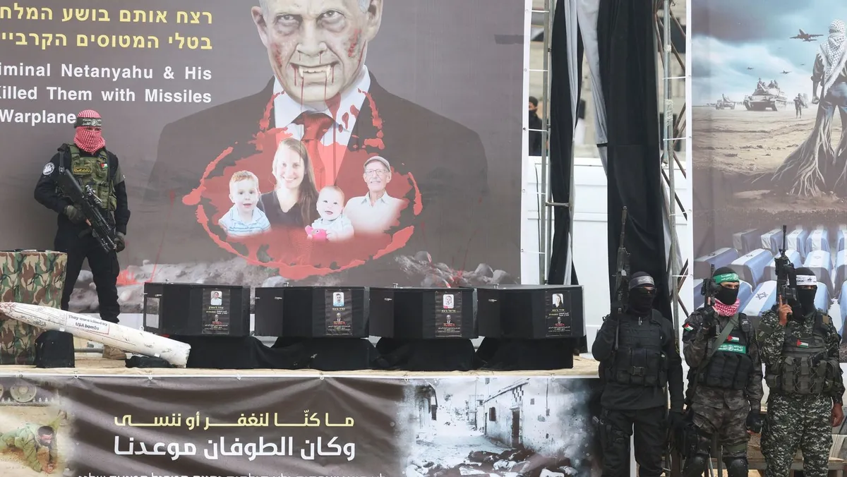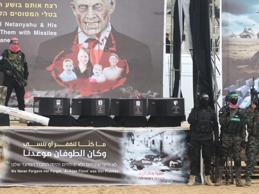 توابيت تحوي جثامين 4 أسرى إسرائيليين، على منصة التسليم في خان يونس، جنوب قطاع غزة. 20 فبراير 2025 - REUTERS