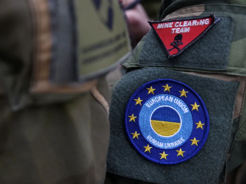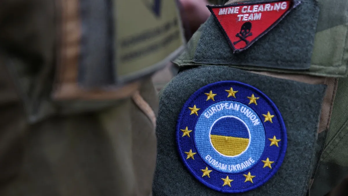 شعار بعثة المساعدة العسكرية التابعة للاتحاد الأوروبي لدعم أوكرانيا (EUMAM Ukraine) مثبت على زي جندي أثناء تدريب في منطقة تابعة للجيش الألماني في ألتينجرابو في ألمانيا. 12 ديسمبر 2023 - reuters