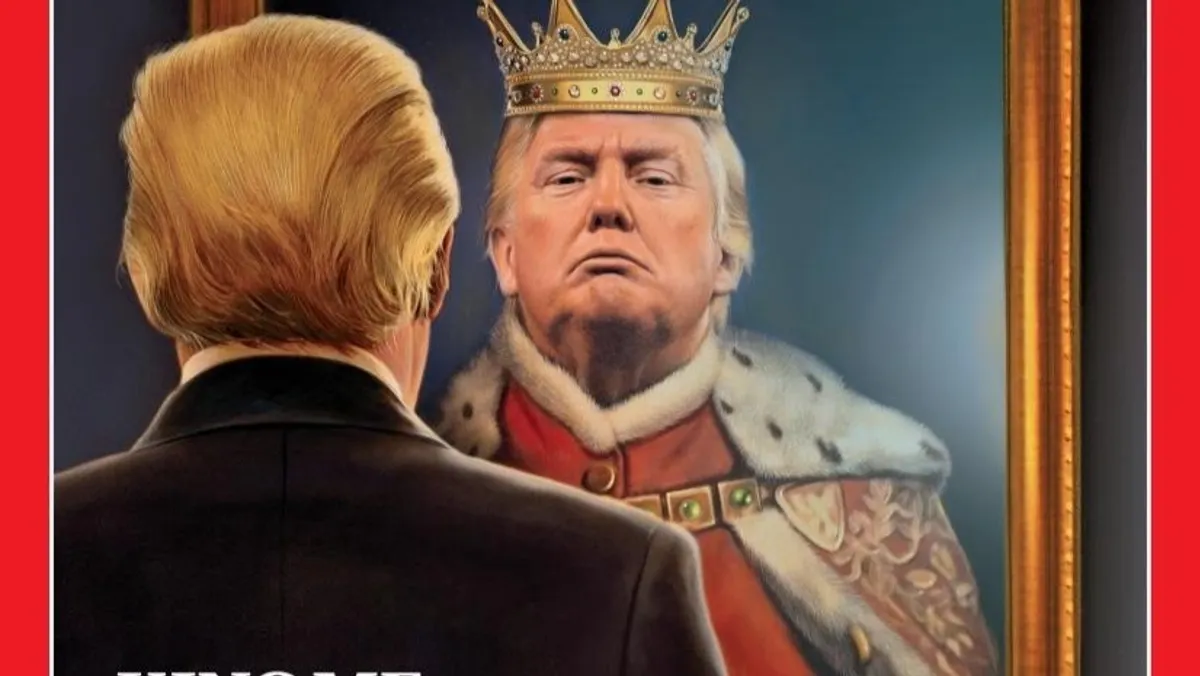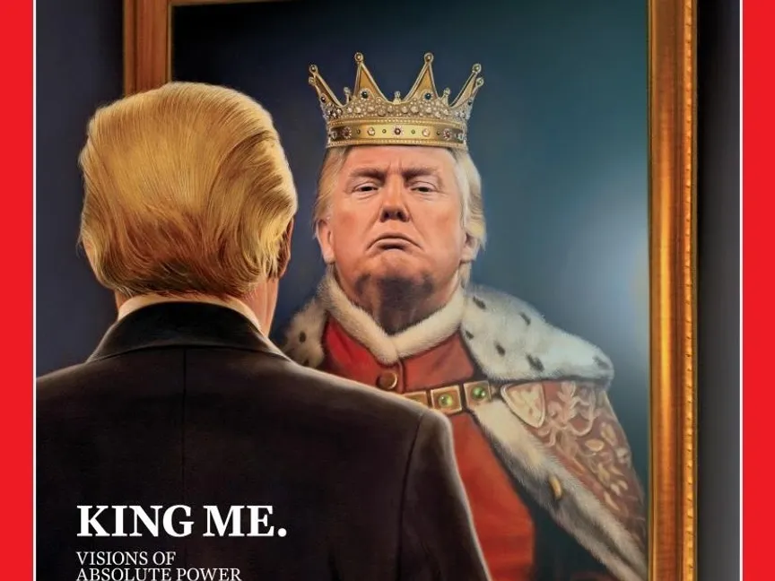 ولمن لا يذكر، فإن مجلة "التايم" نشرت على غلاف عددها الصادر في يونيو من عام 2018، صورة لترمب ينظر في المرآة، ويرى نفسه ملكاً، مع عبارة "نصبوني ملكاً" King me على أسفل يمين الصفحة.