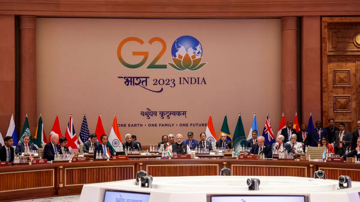رئيس الوزراء الهندي ناريندرا مودي يتحدث في الجلسة الافتتاحية لقمة مجموعة العشرين بالعاصمة نيودلهي. 9 سبتمبر 2023 - AFP