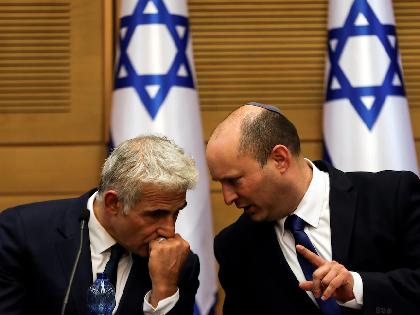 رئيس الوزراء الإسرائيلي نفتالي بينيت ووزير الخارجية يائير لابيد يحضران اجتماعاً لمجلس الوزراء في الكنيست - القدس - 13 يونيو 2021 - REUTERS