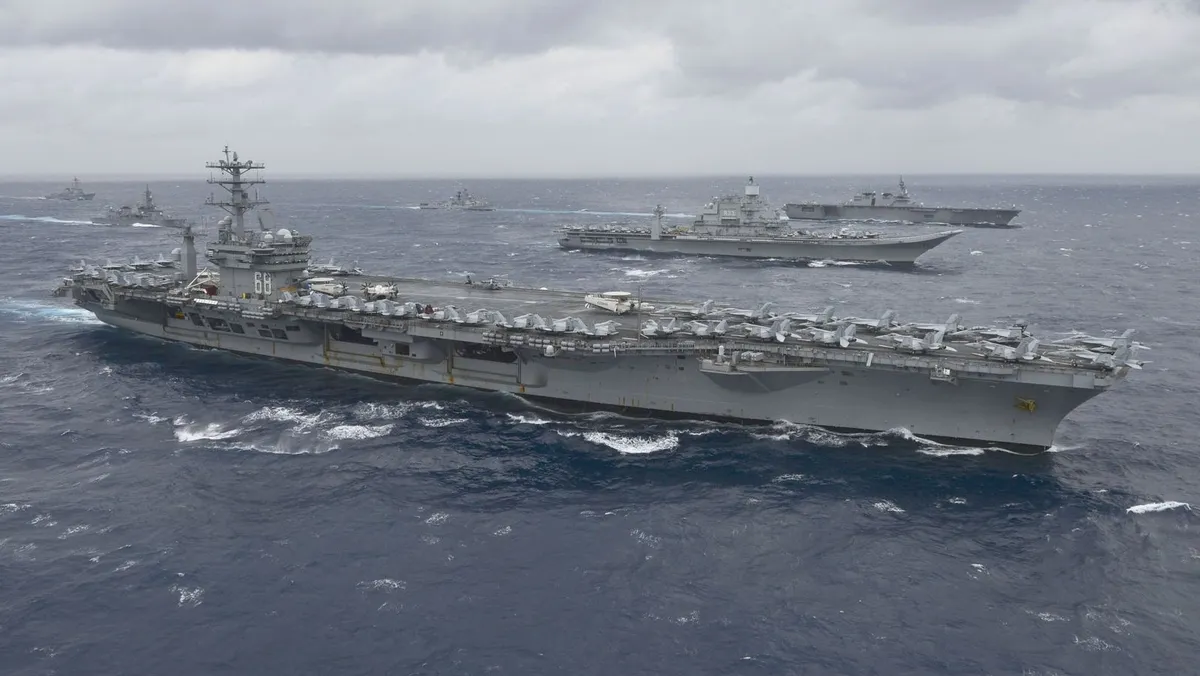 حاملة طائرات أميركية تقود تشكيلاً في خليج البنغال كجزء من تمرين مالابار. 2017 - AFP
