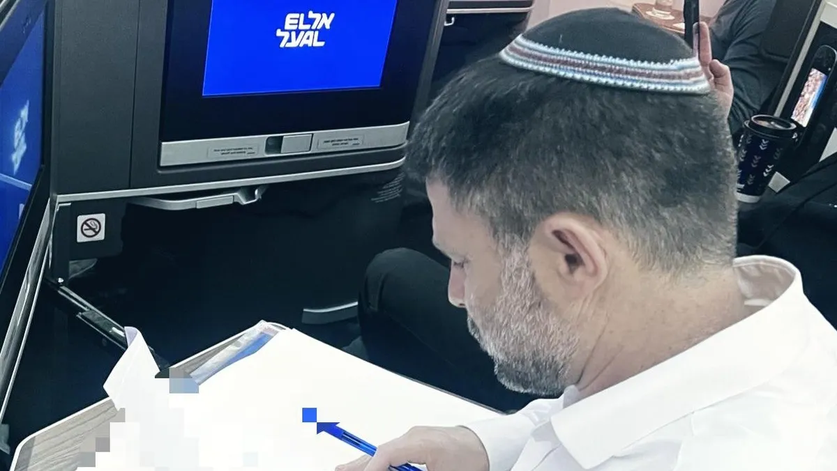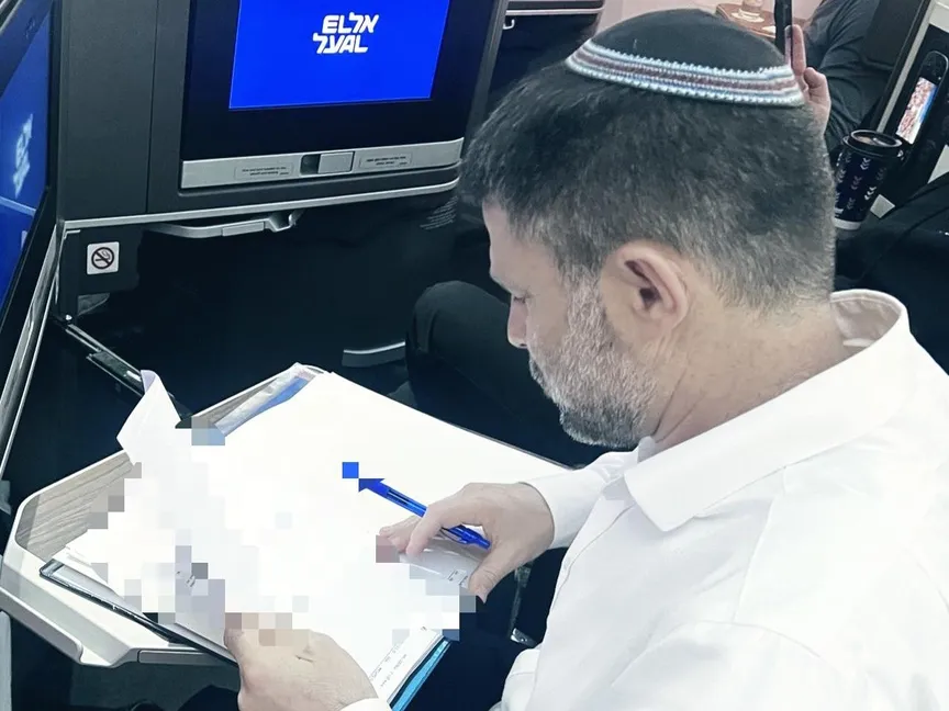 وزير المالية الإسرائيلي بتسلئيل سموتريتش من داخل الطائرة المتجهة إلى الولايات المتحدة. 4 مارس 2025 - @bezalelsm