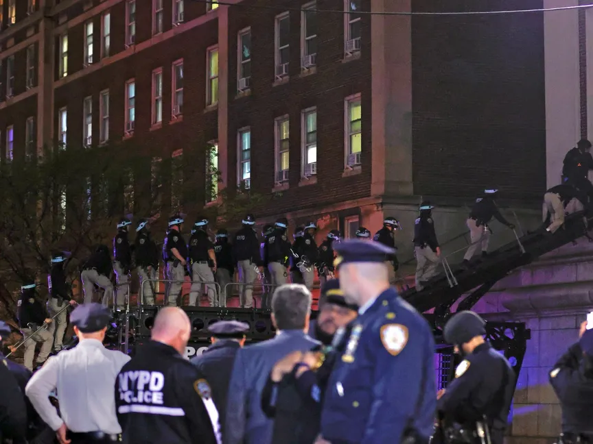 عناصر من شرطة نيويورك يقتحمون حرم جامعة كولومبيا لفض اعتصام طلابي مؤيد للفلسطينيين. 1 مايو 2024 - AFP