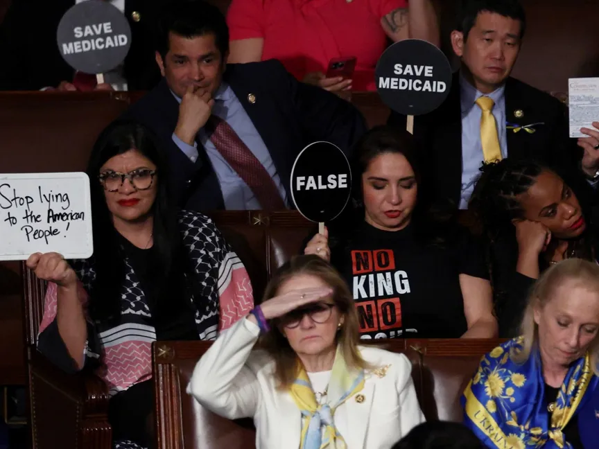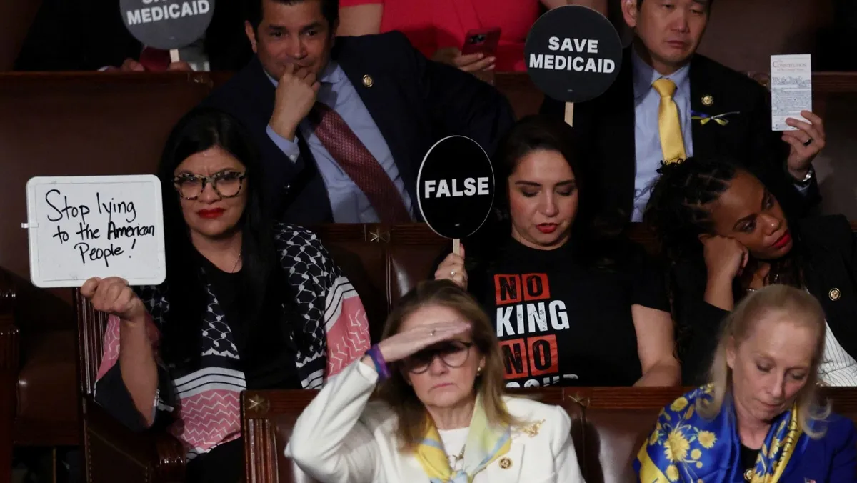 ولوّحت مجموعة من الديمقراطيين في مجلس النواب بلافتات كتب عليها "إيلون ماسك يسرق" و"أنقذوا Medicaid" و"احموا المحاربين القدامى"، فيما أحضرت النائبة رشيدة طليب، لوحاً أبيض وكتبت عليه رسائل مختلفة من خطاب ترمب، بما في ذلك "لا نريد ملكاً" و"توقف عن الكذب على الأميركيين".