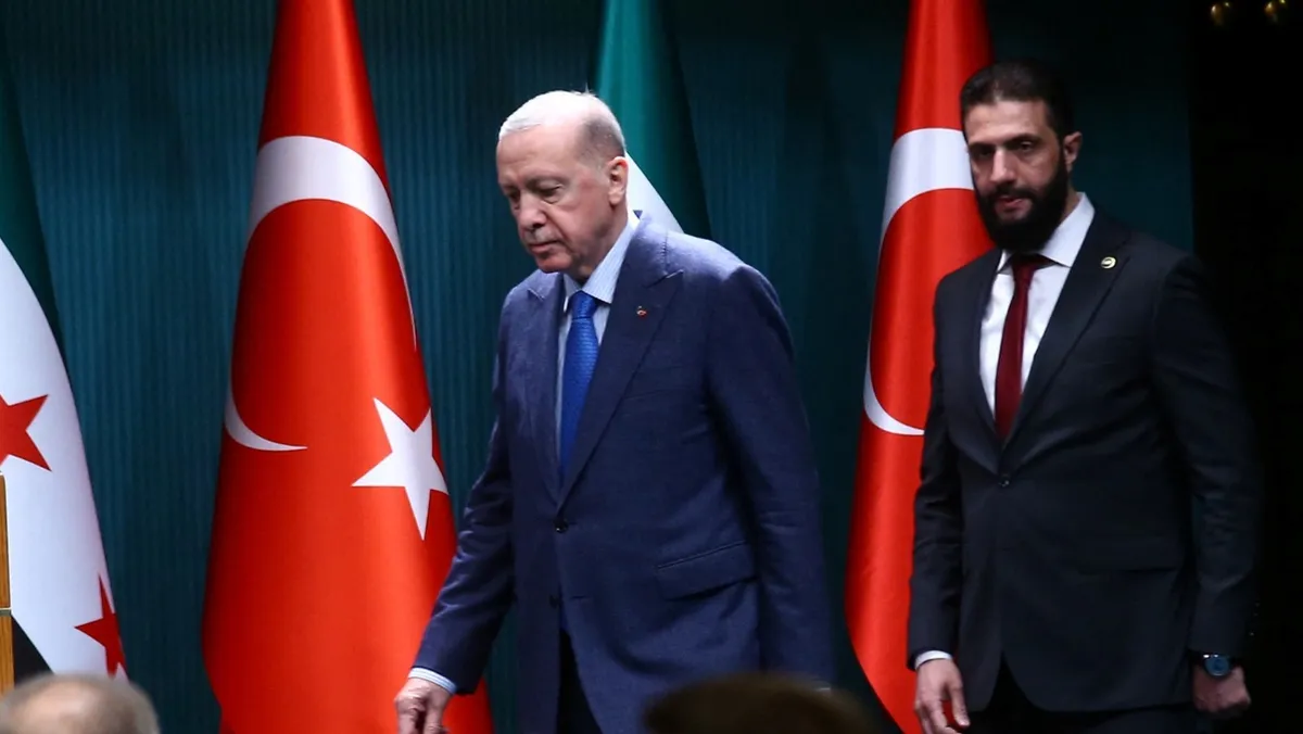 الرئيس السوري أحمد الشرع ونظيره التركي رجب طيب أردوغان يصلان إلى مؤتمر صحافي في أنقرة. 4 فبراير 2025 - REUTERS