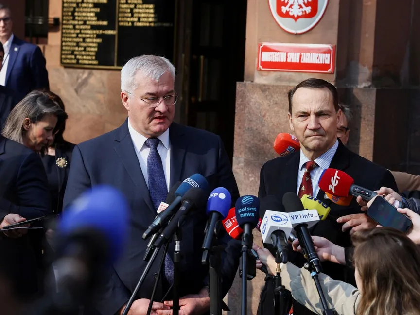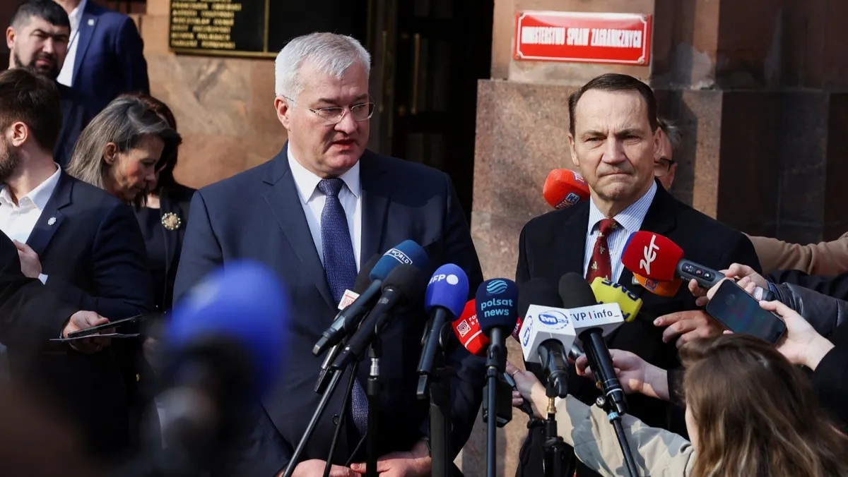 وزيرا خارجية بولندا رادوسلاف سيكورسكي (يمين) وأوكرانيا أندريه سيبيها (يسار) في وارسو. 12 مارس 2025 - Reuters