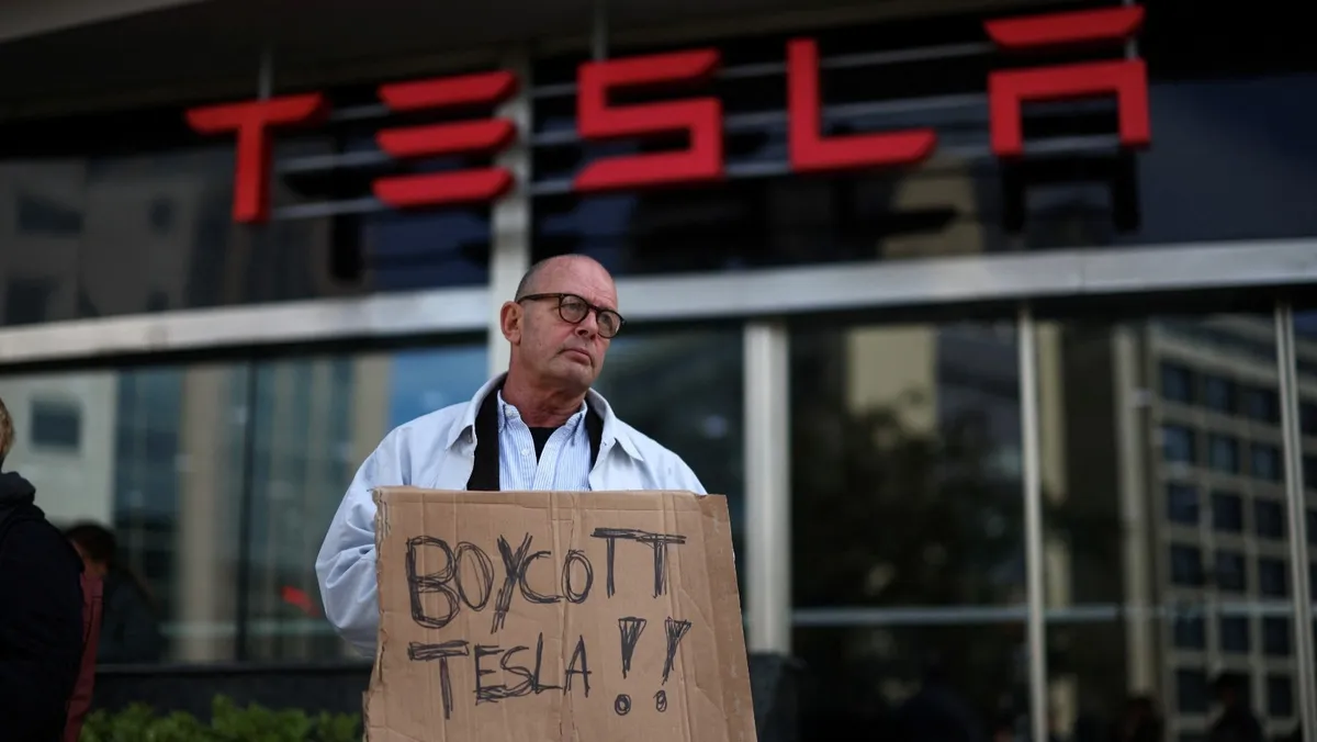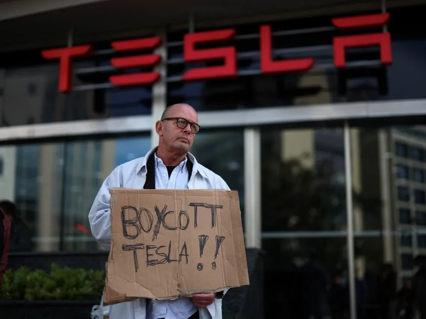 شخص لافتة كتب عليها "قاطع تسلا" خارج وكالة تسلا في لشبونة بالبرتغال. 9 مارس 2025 - Reuters