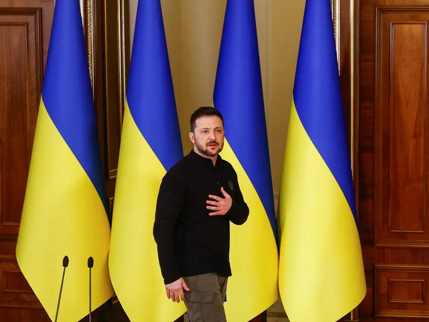 الرئيس الأوكراني فولوديمير زيلينسكي خلال مؤتمر صحافي في كييف. 12 مارس 2025 - Reuters