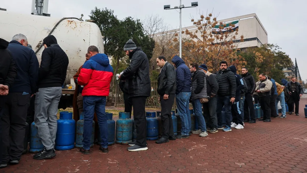 أشخاص يصطفون لملء أسطوانات الغاز الخاصة بهم في ساحة الأمويين بالعاصمة السورية دمشق. 31 ديسمبر 2024 - Reuters