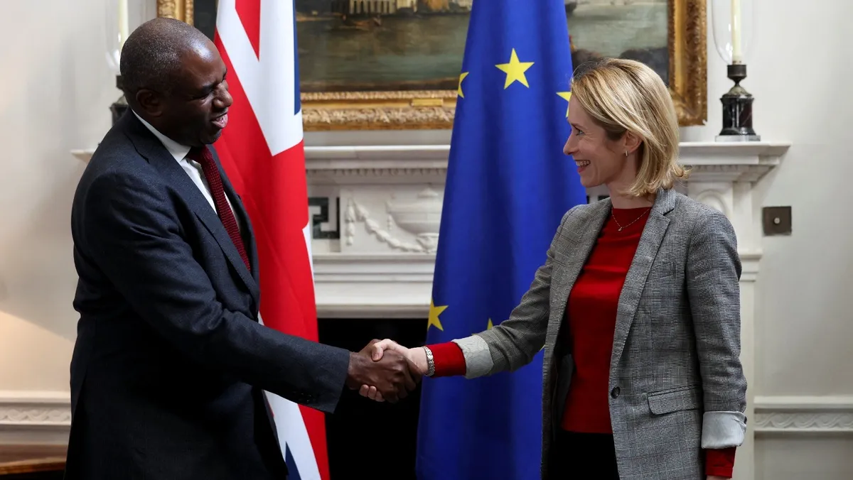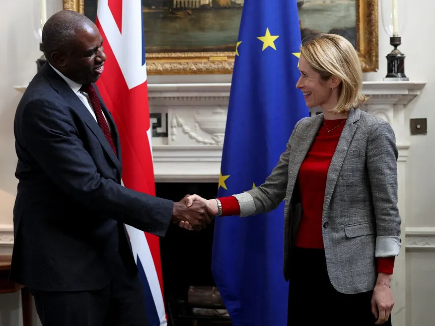 وزير الخارجية البريطاني ديفيد لامي يستقبل مسؤولة السياسة الخارجية والأمنية في الاتحاد الأوروبي كايا كالاس في لندن. 18 مارس 2025 - REUTERS