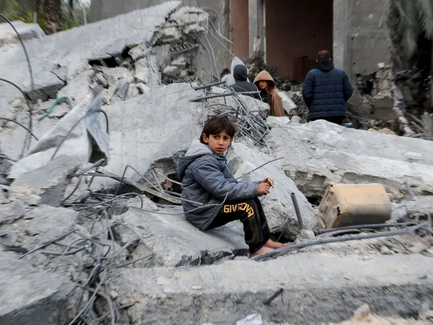 طفل فلسطيني يجلس على أنقاض منزل دمرته الغارات الإسرائيلية في خان يونس بشمال قطاع غزة. 20 مارس 2025 - REUTERS