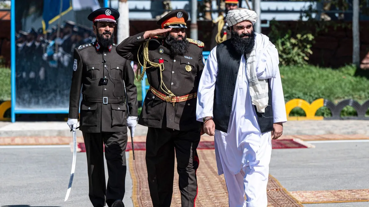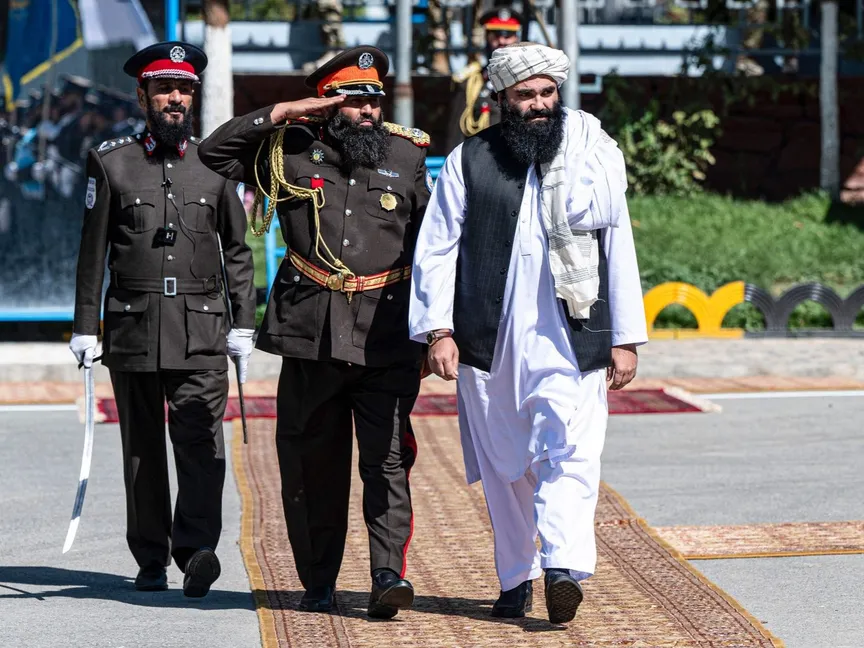 وزير الداخلية الأفغاني (يمين) يستعرض أفراد الأمن المجندين حديثاً خلال حفل تخرجهم في أكاديمية الشرطة بكابول. 5 أكتوبر 2023 - AFP