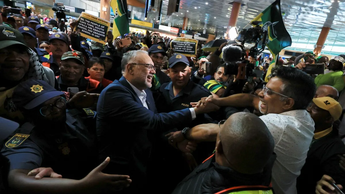 في مشهد يعكس الدعم الشعبي الكبير، استُقبل السفير الجنوب إفريقي إبراهيم رسول استقبالاً كبيراً في بلاده، وذلك بعدما تم طرده مؤخراً من الولايات المتحدة، وأُعلن أنه "شخص غير مرغوب فيه" من قِبَل إدارة الرئيس الأميركي دونالد ترمب، حسبما أفادت صحيفة "الجارديان".