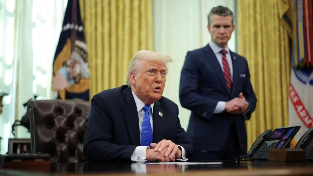 الرئيس الأميركي دونالد ترمب مع وزير الدفاع بيت هيجسيث في البيت الأبيض بالعاصمة واشنطن. 21 مارس 2025 - REUTERS