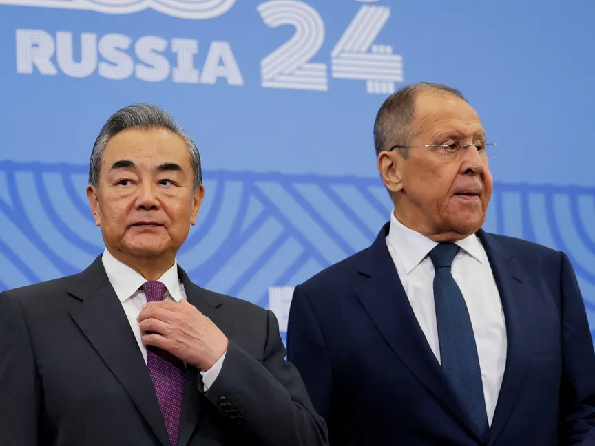 وزير الخارجية الروسي سيرجي لافروف (اليمين) يقف إلى جوار نظيره الصيني وانج يي (اليسار) خلال اجتماع مجموعة "بريكس" في مدينة نيجني نوفجورود بروسيا. 11 يونيو 2024 - Reuters