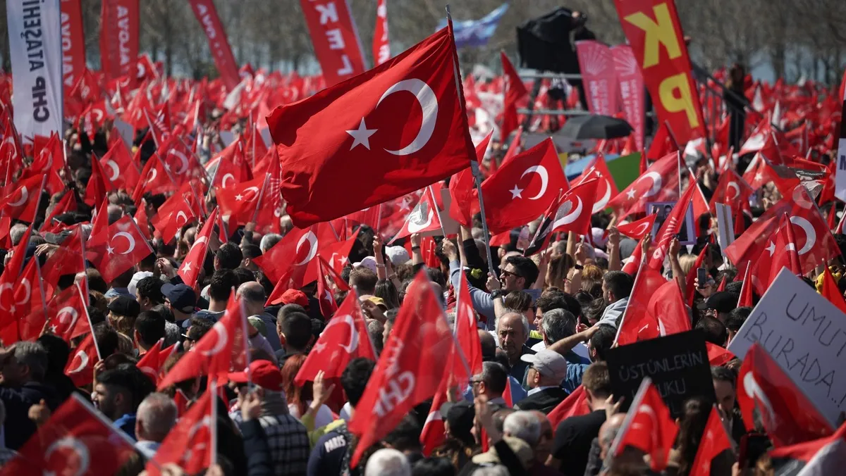 وتدفق عشرات الآلاف رافعين الأعلام التركية واللافتات إلى ساحة التجمع المطلة على البحر في مال تبه (أحد أحياء إسطنبول) على الجانب الآسيوي من المدينة للمشاركة في تجمع "الحرية لإمام أوغلو" الذي نظمه حزب الشعب الجمهوري.
