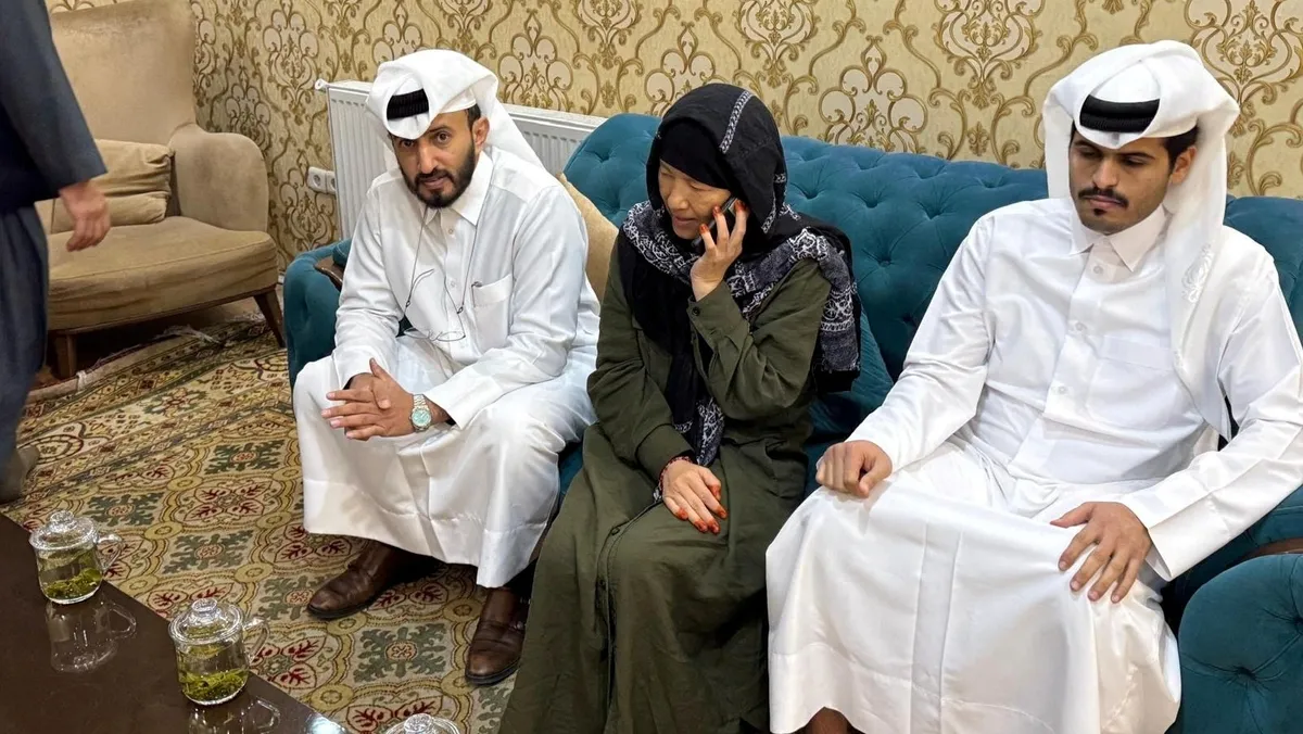 فاي هول، التي أُفرج عنها من محادثات احتجاز طالبان عبر الهاتف بجوار قائم بالأعمال في سفارة قطر في كابول، أفغانستان. 29 مارس 2025. - Reuters