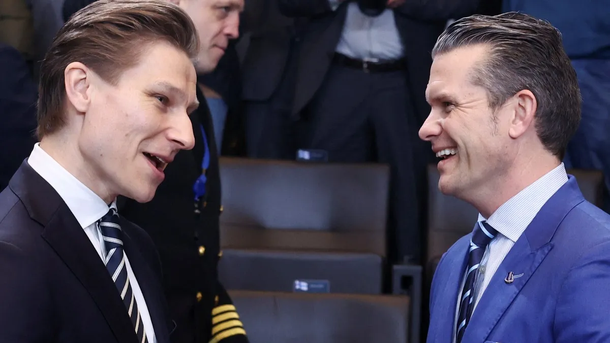 وزير الدفاع الأميركي بيت هيجسيث ونظيره الفنلندي أنتي هاكانين بعد اجتماع لوزراء دفاع حلف الناتو  في بروكسل. 13 فبراير 2025 - reuters