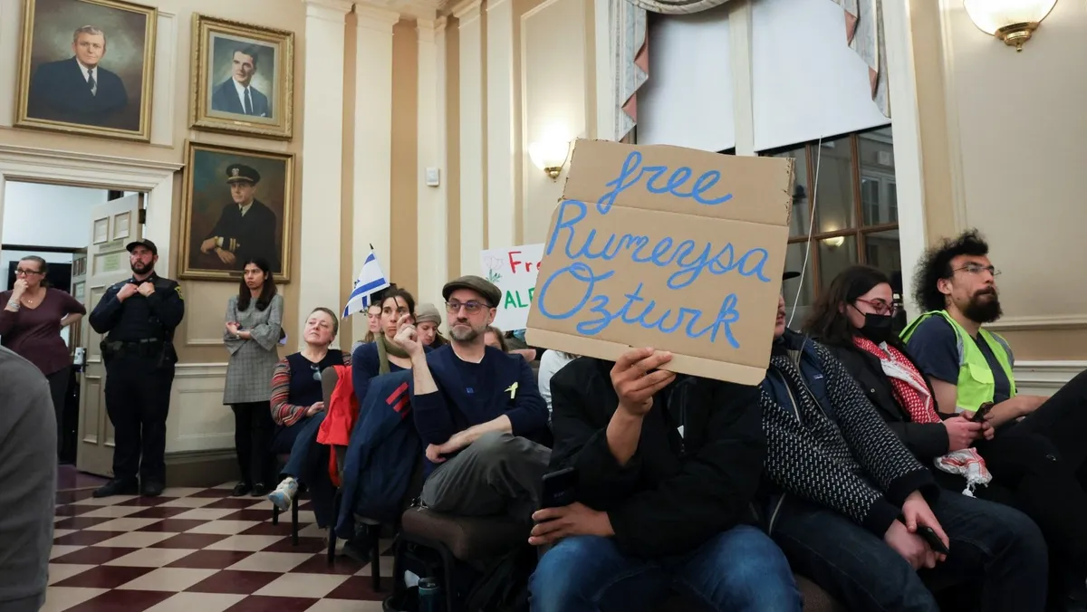 احتجاج في مجلس مدينة سومرفيل بولاية ماساتشوستس على اعتقال الطالبة التركية روميسا أوزتورك. 27 مارس 2025 - Reuters