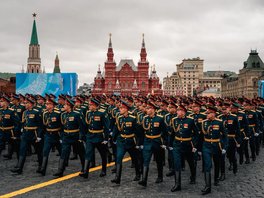 جنود روس خلال الاحتفال بذكرى "يوم النصر" على النازية في الساحة الحمراء بالعاصمة موسكو. 9 مايو 2021 - AFP