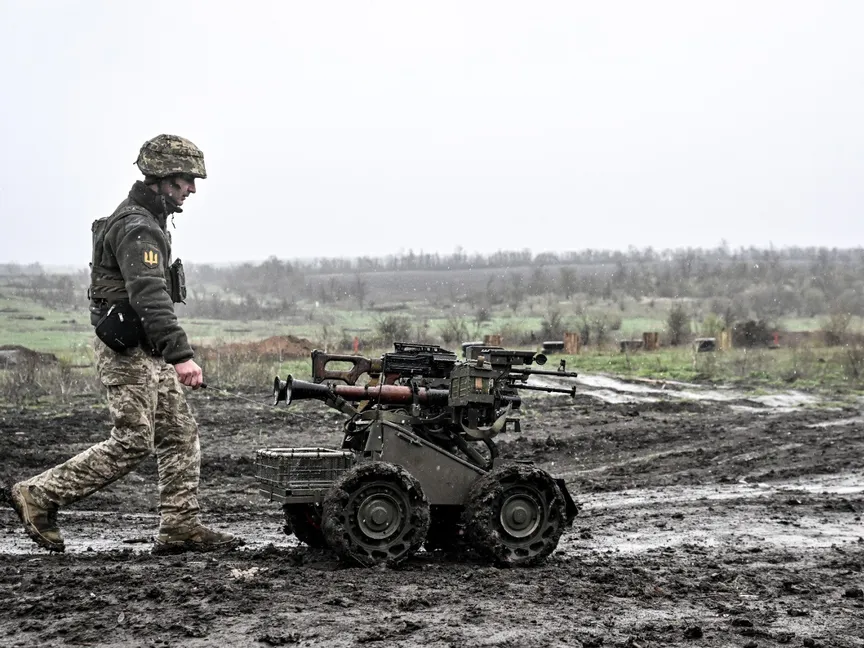 جندي أوكراني يتبع مسيّرة قتالية أرضية من طراز Gnom-2 خلال اختبارات ميدانية في أوكرانيا. 9 أبريل 2025 - Reuters