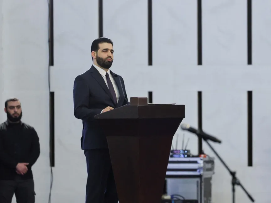 وزير الداخلية السوري الجديد أنس خطاب خلال مؤتمر صحافي لإعلان تشكيل الحكومة في دمشق. 29 مارس 2025 - REUTERS