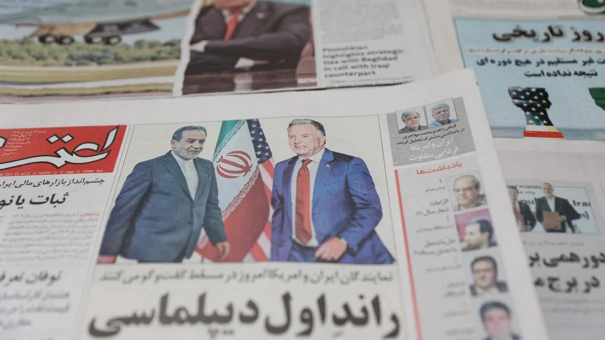 صورة لوزير الخارجية الإيراني عباس عراقجي والمبعوث الأميركي إلى الشرق الأوسط ستيف ويتكوف على غلاف صحيفة إيرانية في طهران. 12 أبريل 2025 - REUTERS