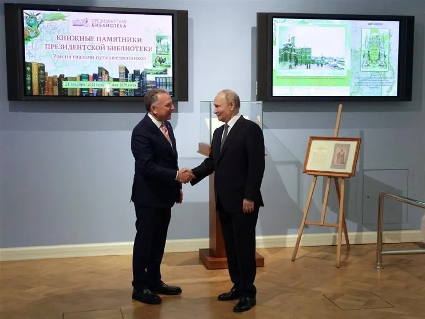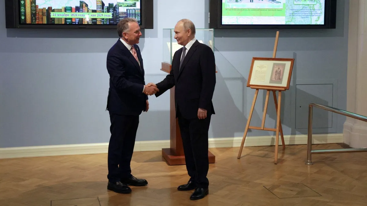 الرئيس الروسي فلاديمير بوتين يصافح ستيف ويتكوف المبعوث الخاص للرئيس الأميركي دونالد ترمب خلال اجتماع في سانت بطرسبرج روسيا. 11 أبريل 2025 - Reuters