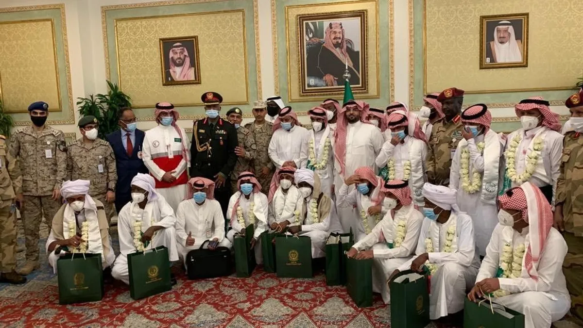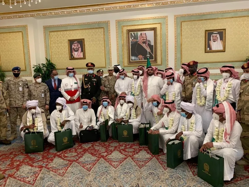 الأسرى السعوديون والسودانيون العائدون لدى استقبالهم في قاعدة الملك سلمان الجوية بالرياض