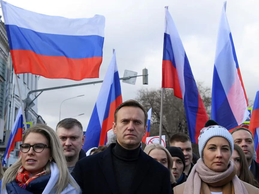 المعارض الروسي أليكسي نافالني وزوجته يوليا خلال تظاهرة لإحياء ذكرى مقتل ناقد الكرملين بوريس نيمتسوف في وسط موسكو - 29 فبراير 2020 - AFP