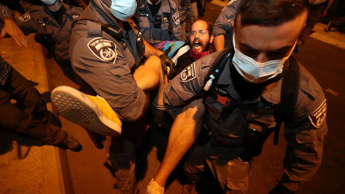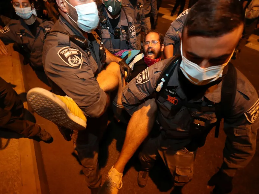 ويتجمع المتظاهرون المعارضون للحكومة، كل مساء سبت منذ يوليو الماضي، احتجاجاً على الإدارة الاقتصادية والصحية لجائحة "كوفيد-19"، من قبل حكومة بنيامين نتانياهو، المتهم بالفساد.