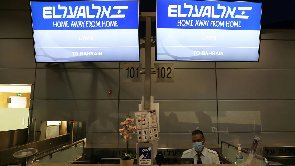 شاشة في مطال تل أبيب تُظهر بيانات الرحلة التي ستقل الوفدين الإسرائيلي والأميركي إلى البحرين - REUTERS