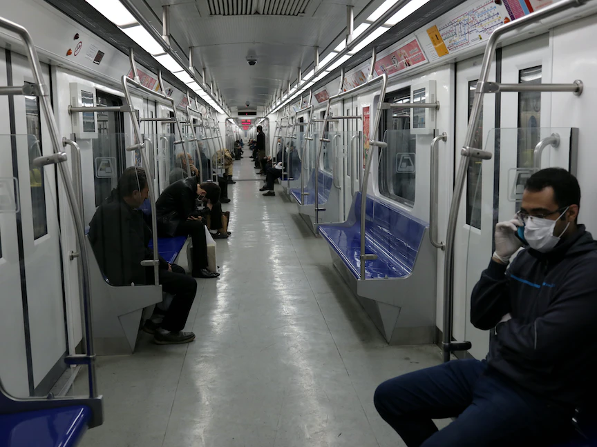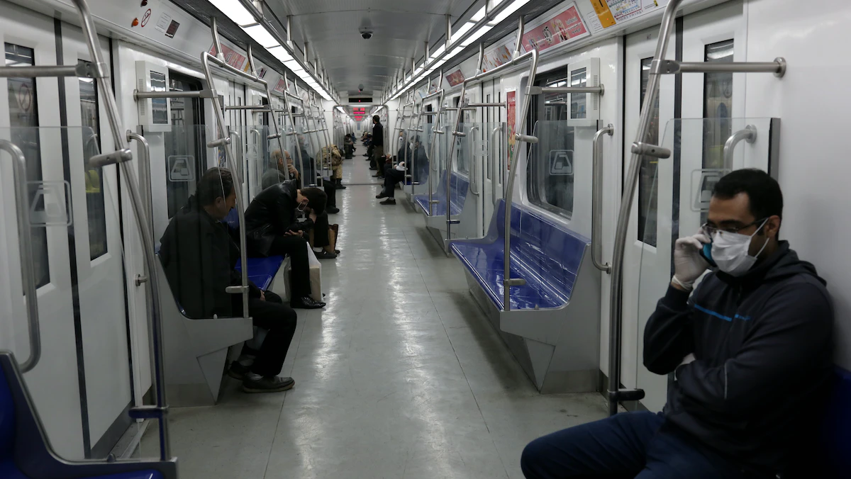 أشخاص يرتدون أقنعة الوجه في أحد القطارات بالعاصمة الإيرانية طهران - 17 مارس 2020 - VIA REUTERS