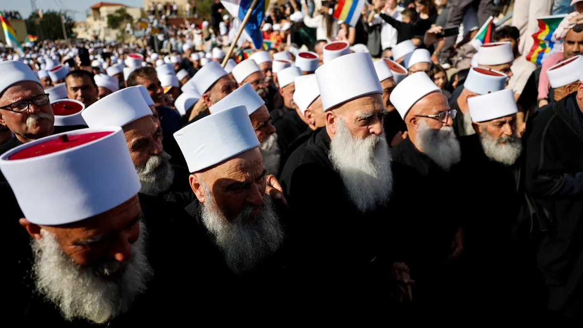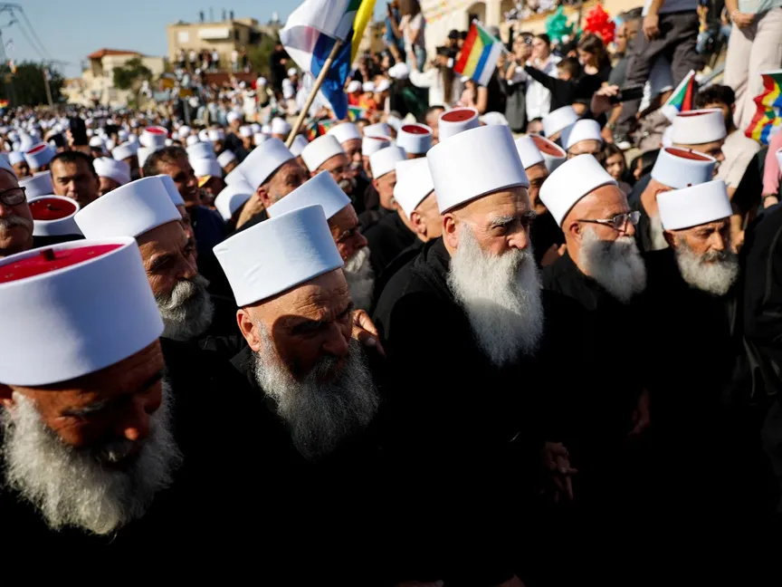 الزعيم الروحي للطائفة الدرزية في إسرائيل الشيخ موفق طريف رفقة شيوخ دروز من سوريا في مقام النبي شعيب شمال إسرائيل- في 14 مارس 2025 - Reuters