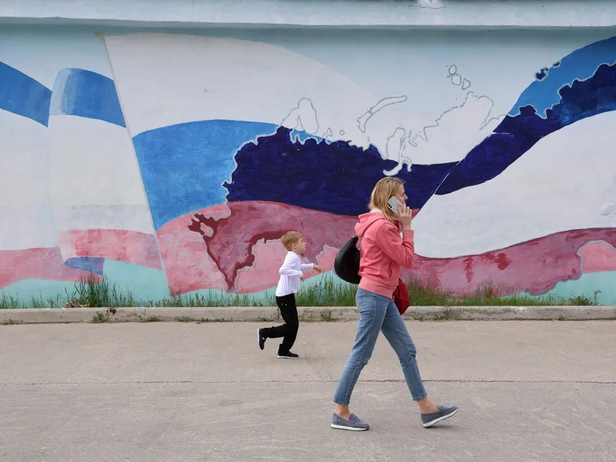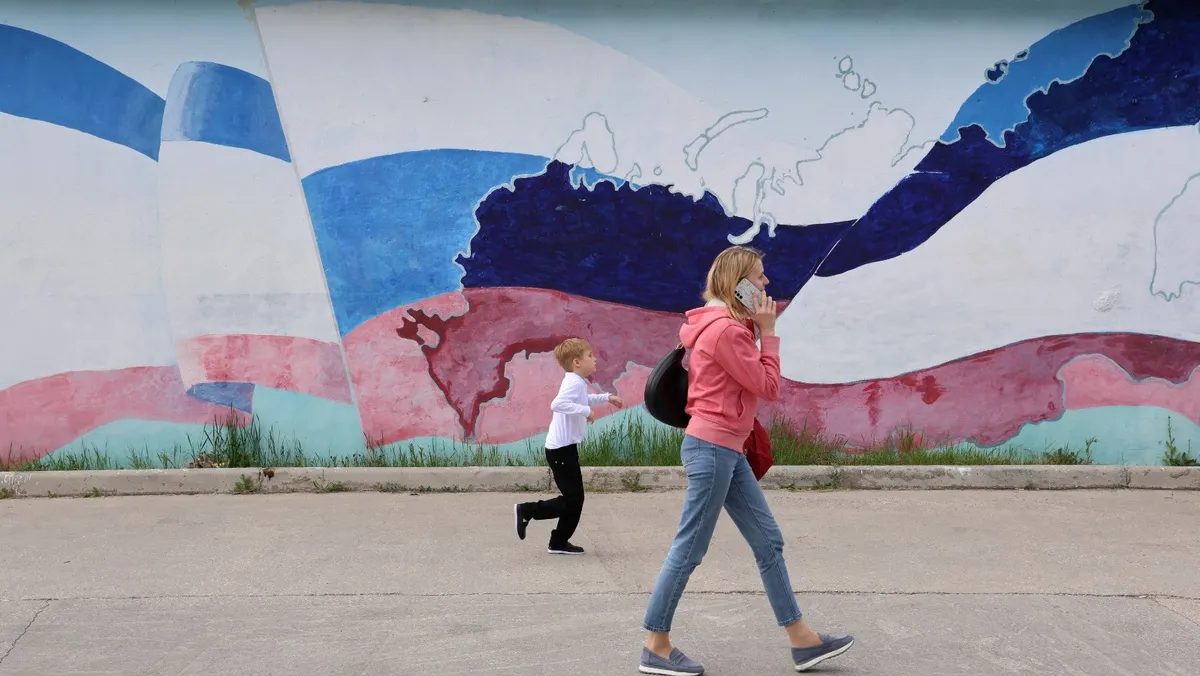 أشخاص يمرون أمام جدارية بألوان العلم الروسي في يفباتوريا في شبه جزيرة القرم. 24 أبريل 2025 - reuters