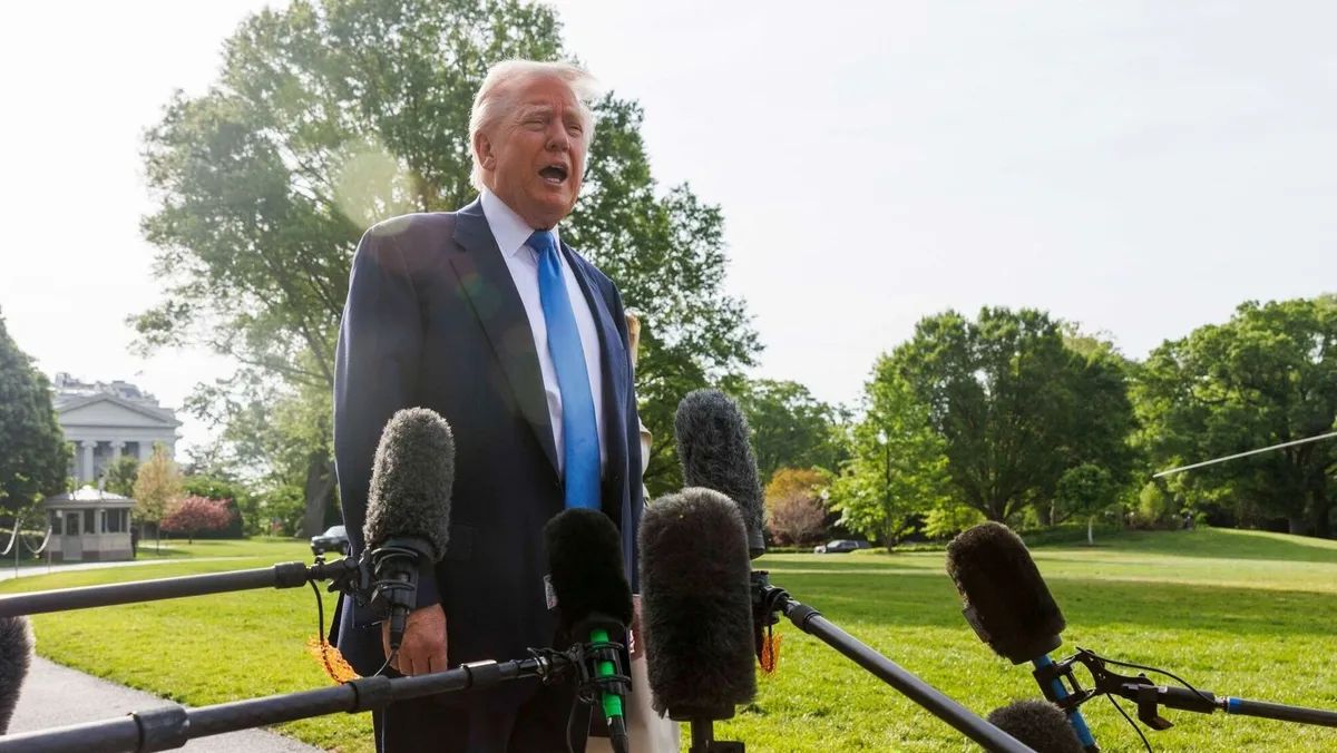 الرئيس الأميركي دونالد ترمب يتحدث إلى وسائل الإعلام في الحديقة الجنوبية للبيت الأبيض. 25 أبريل 2025 - Bloomberg