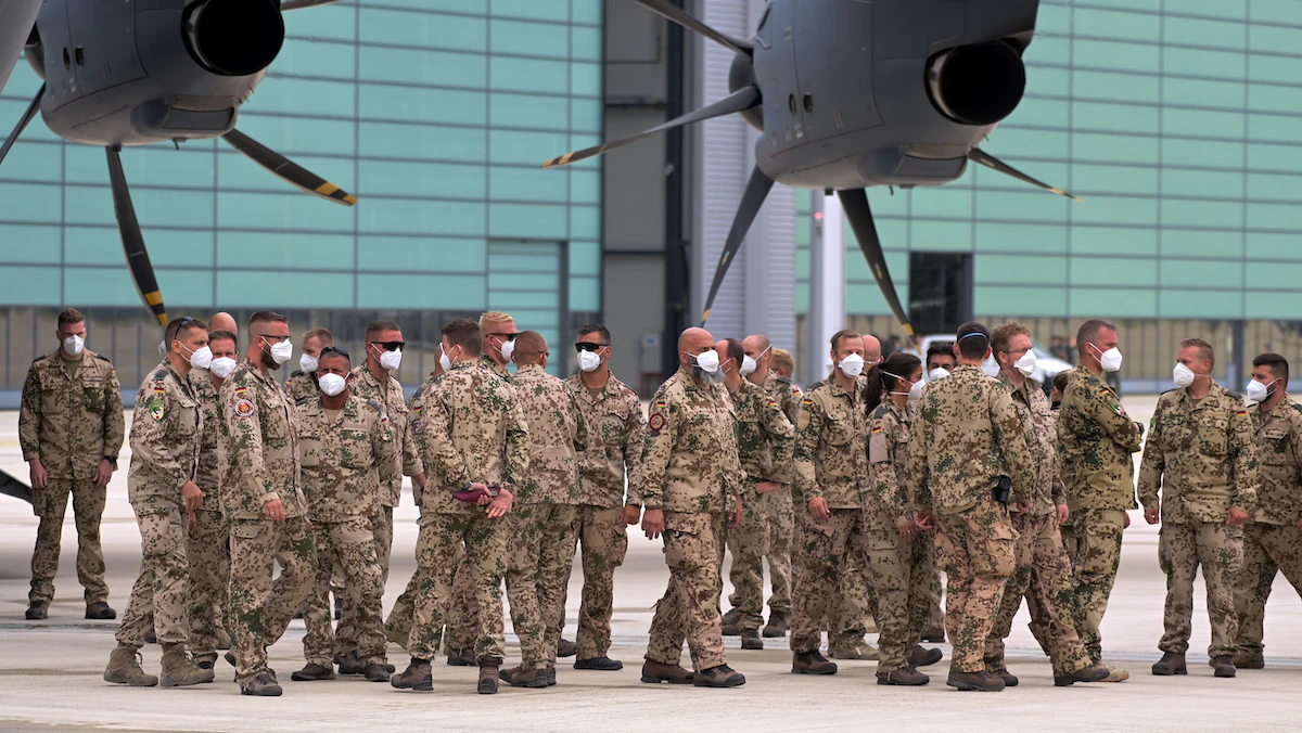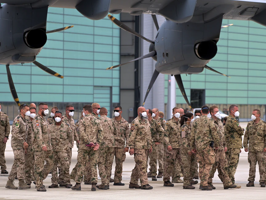 جنود ألمان يتجمعون قرب طائرة تابعة للقوات المسلحة الألمانية بعد عودتهم من أفغانستان في مطار ونستورف بألمانيا - 30 يونيو 2021 - REUTERS