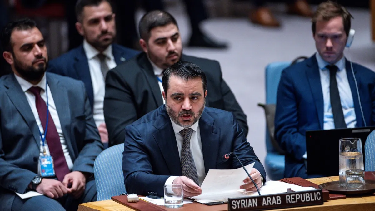 وزار الشيباني الولايات المتحدة لحضور اجتماعات في الأمم المتحدة، حيث رفع العلم السوري ذي النجوم الثلاث ليكون العلم الرسمي لسوريا بعد 14 عاماً من اندلاع الحرب.