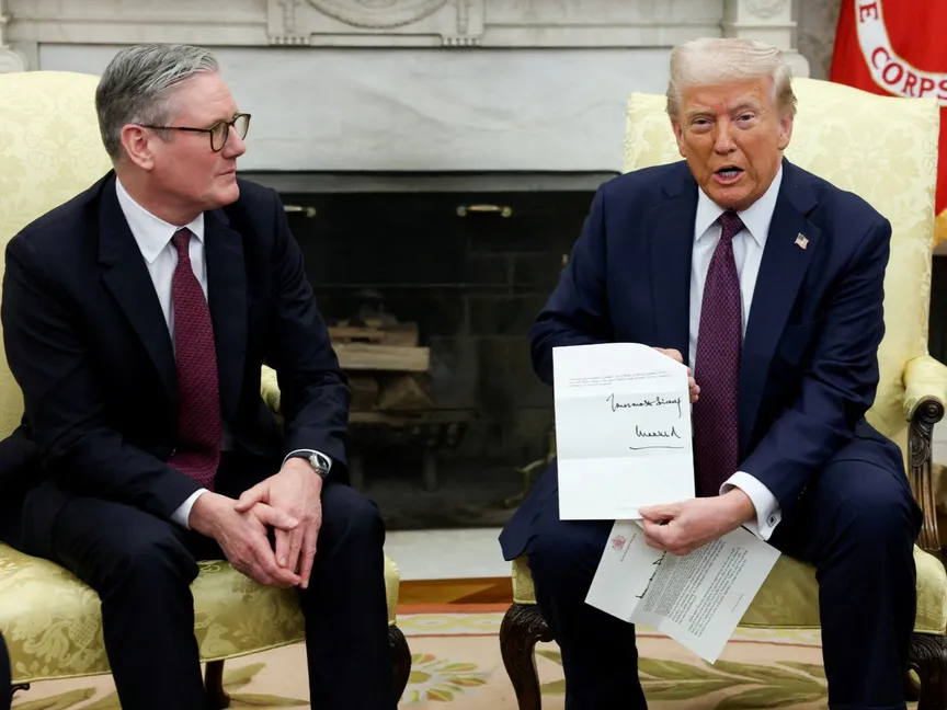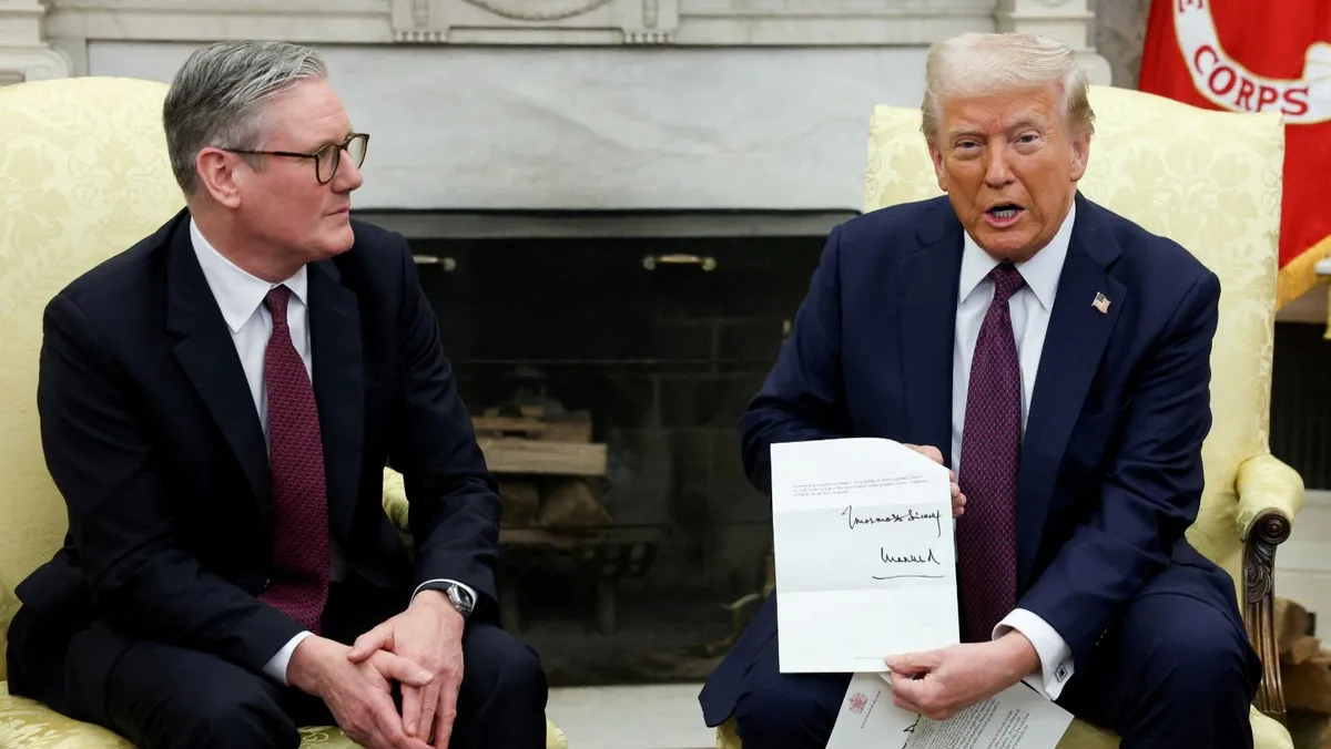 الرئيس الأميركي دونالد ترمب يحمل رسالة من ملك بريطانيا تشارلز أثناء لقائه برئيس الوزراء البريطاني كير ستارمر في المكتب البيضاوي بالبيت الأبيض في واشنطن العاصمة بالولايات المتحدة. 27 فبراير 2025 - REUTERS