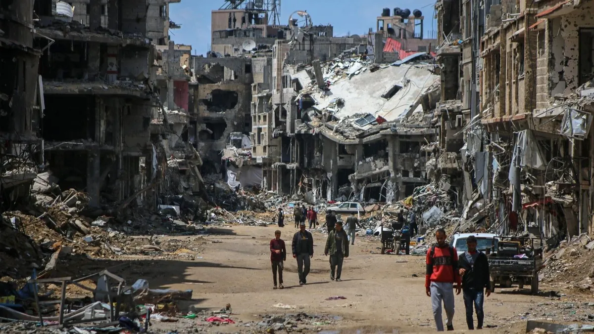 فلسطينيون يسيرون وسط منازل دمرها الجيش الإسرائيلي في خان يونس، جنوب قطاع غزة. 10 أبريل 2024 - Bloomberg