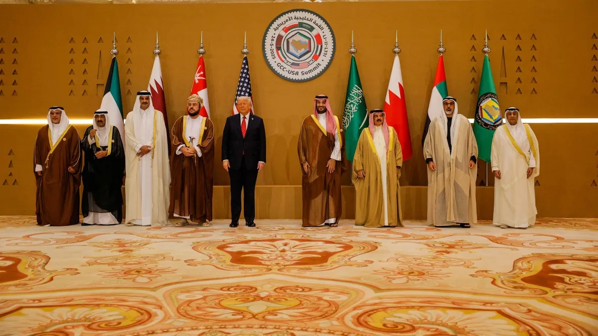 الرئيس الأميركي دونالد ترمب يتوسط قادة مجلس التعاون قبل القمة الأميركية الخليجية في الرياض. 14 مايو 2025 - REUTERS