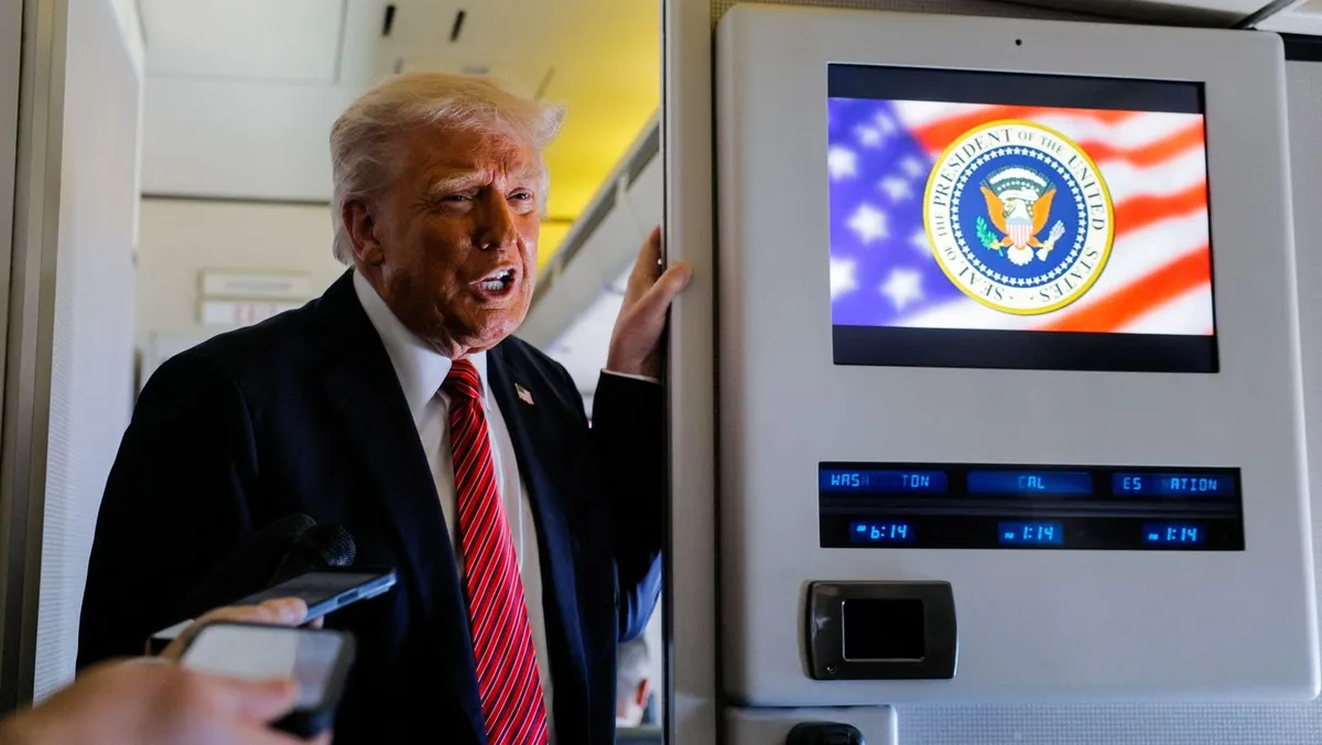 الرئيس الأميركي دونالد ترمب يدلي بتصريحات للصحافيين على متن طائرته الرئاسية Air Force 1 في طريقه إلى الدوحة. 14 مايو 2025 - REUTERS