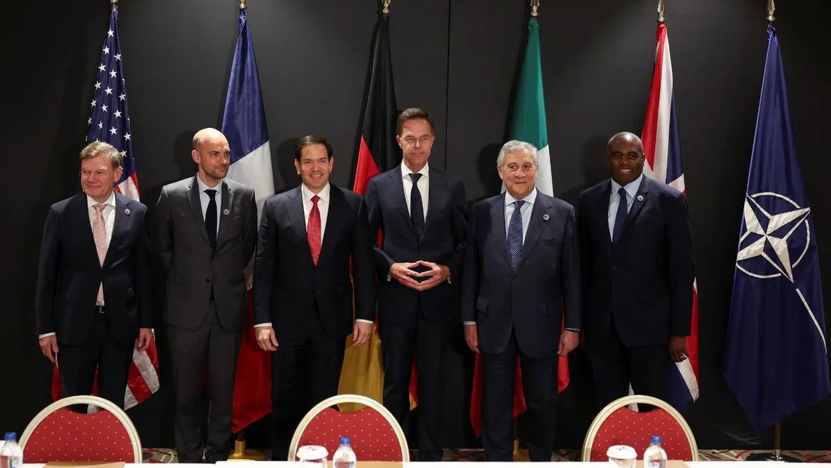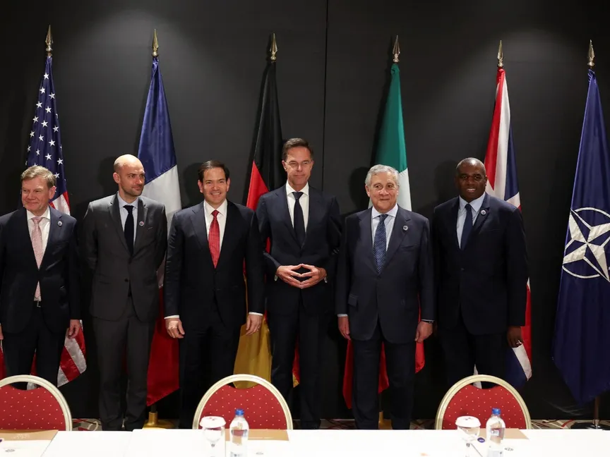 الأمين العام لحلف شمال الأطلسي مارك روته ووزراء خارجية الولايات المتحدة وبريطانيا وألمانيا وفرنسا وإيطاليا خلال أعمال اجتماع غير رسمي لوزراء خارجية حلف شمال الأطلسي بأنطاليا جنوب تركيا. 15 مايو 2025 - Reuters