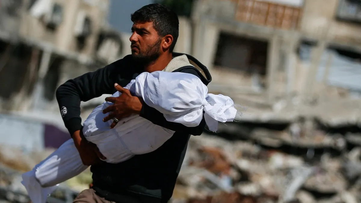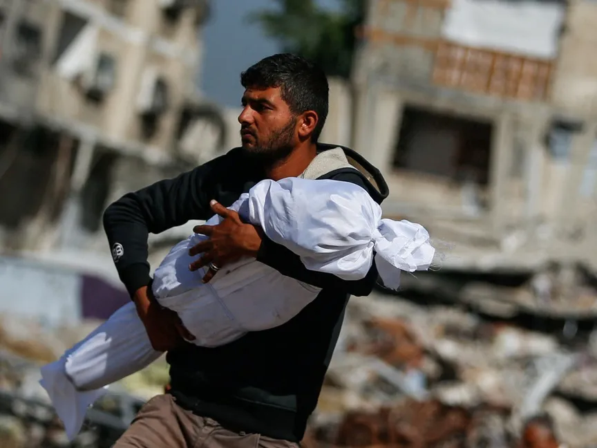 فلسطيني يحمل جثمان طفل قتلته غارات إسرائيلية في جباليا، شمال قطاع غزة. 16 مايو 2025 - Reuters