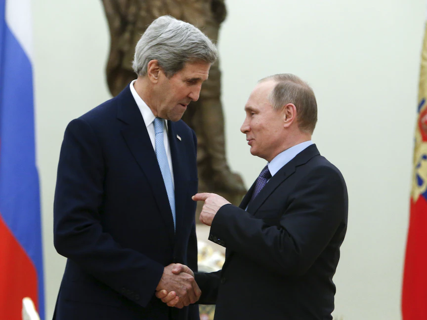 الرئيس الروسي فلاديمير بوتين وجون كيري حين كان وزيراً الخارجية الأميركية خلال لقاء في الكرملين - 15 ديسمبر 2015 - REUTERS