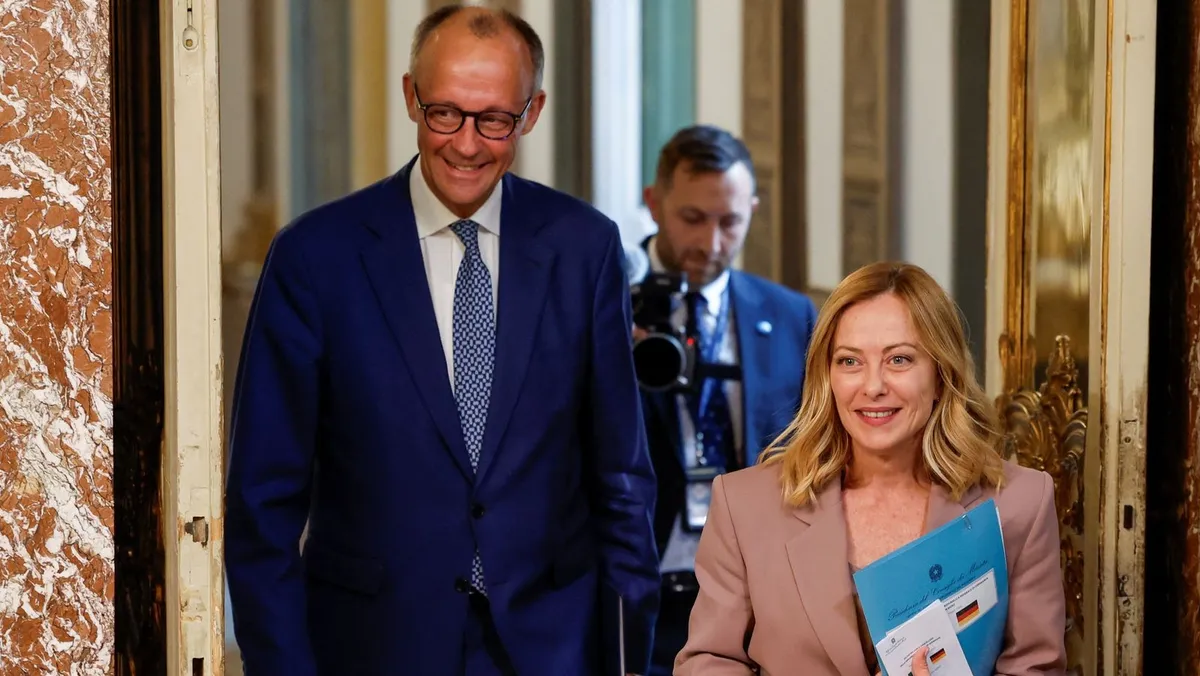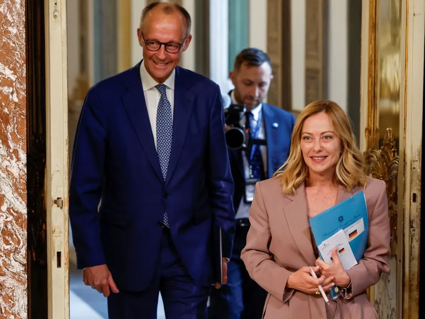 رئيسة الوزراء الإيطالية جورجيا ميلوني والمستشار الألماني فريدريش ميرتس يتوجهان لحضور مؤتمر صحفي في قصر كيجـي بالعاصمة الإيطالية روما، 17 مايو 2025 - REUTERS